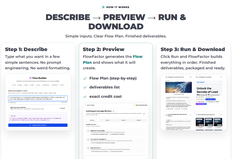 FlowFactor AI creates connected workflows (Flows) that plan, generate, and assemble everything in the correct order.